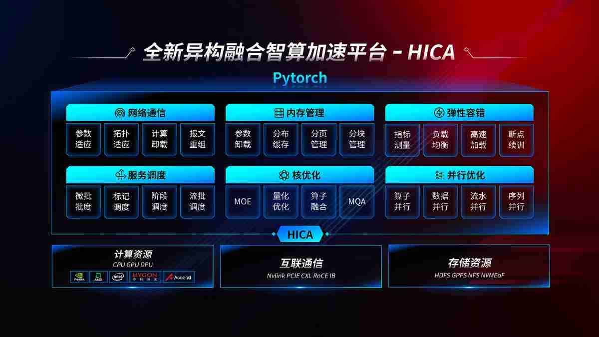 通过自研的服务层、、中间适配层、、、、以及调度编排算法,,采用数据并行、、、模型并行等多种并行方式,,把并行计算任务进行有效的分解,,,,使其分别由相应的软件栈和算力资源来承接。。当GPU资源变化,,,HICA可以实时动态调度计算子任务并调整模型拓扑和架构,,以充分聚合各种算力资源。。。