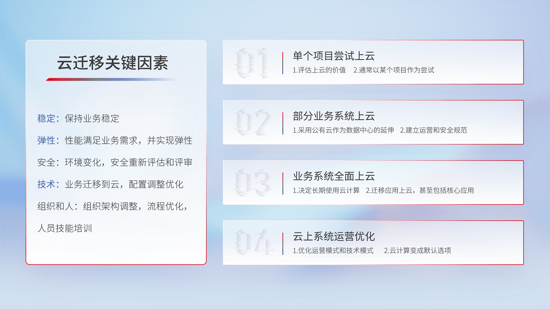 结合实际业务,,,,从规划设计、、、云平台选型、、云原生改造、、、数据迁移、、、、集成交付,,,迁移全过程为客户识别最佳上云路径,,,,做好风险识别管理,,,设计网络架构、、身份权限、、、安全审计合规、、、、操作审计、、、、日志审计、、、、监控告警策略、、、多站点容灾设计等,,,,对云上基础设施进行整体规划,,提升IT治理水平,,,,以满足弹性、、、高可用、、、、高性能的需求。。。。
