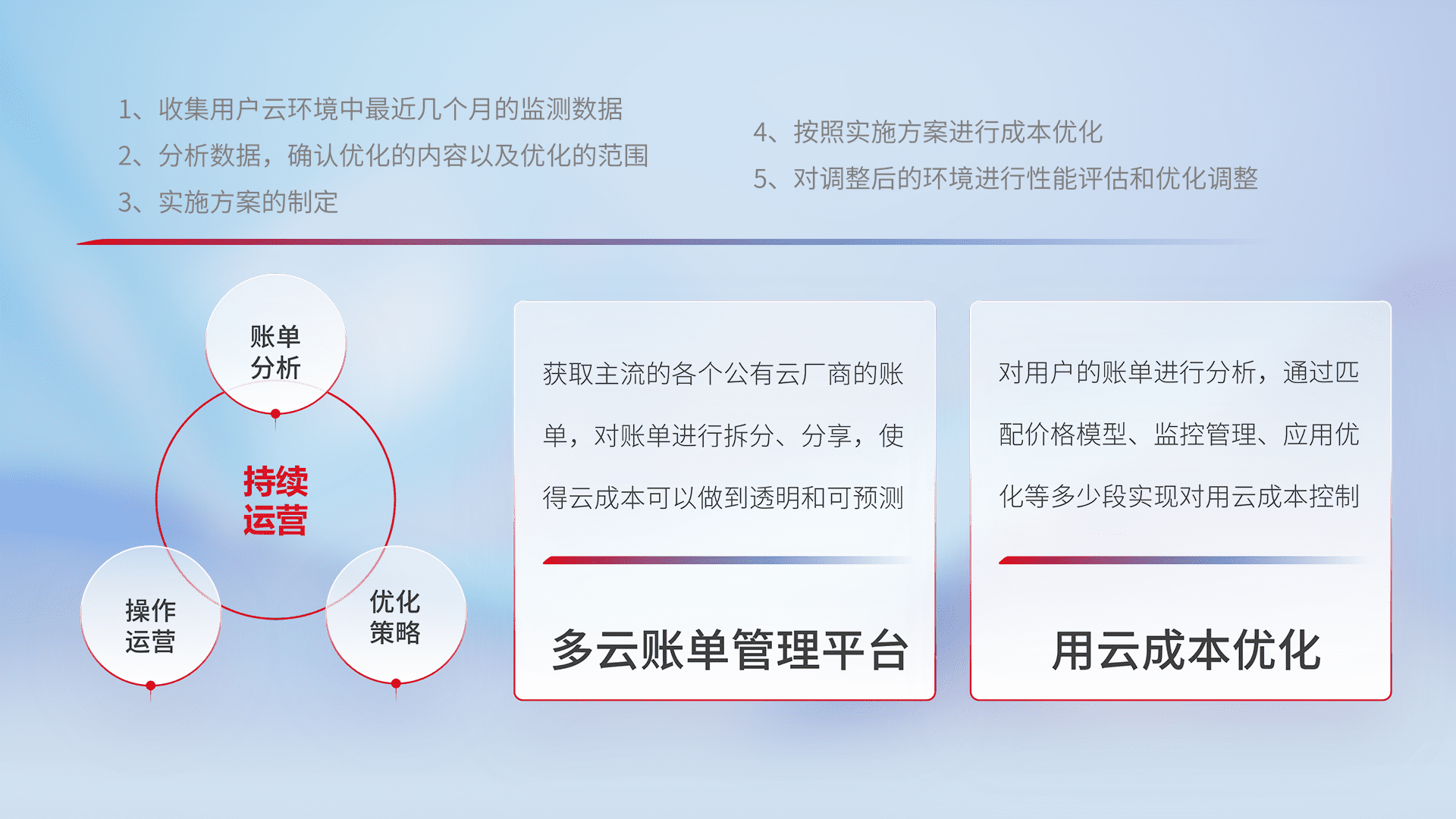通过多云纳管,,,,以统一的资源数据模型把客户的云资源进行抽象和封装,,,,进而实现对多云资源的统一操作,,,保障云资源管理的可靠性、、、稳定性与可用性。。。量身定制化运维内容,,,配置、、、、开发运维、、、、补丁管理、、、、备份、、、监控、、、认证和访问管理、、审计和日常巡检等,,,保障在用云过程中的可靠度,,,,稳定度以及高可用率。。。